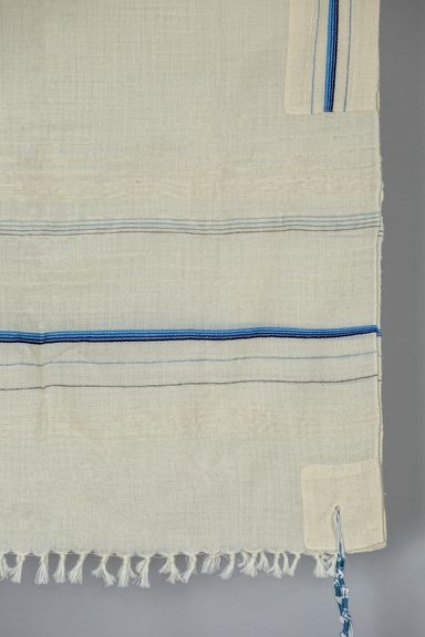 טלית מצמר מחוספס בצבע שמנת, עם פס א-סימטרי בארבעה גוונים שונים של כחול.