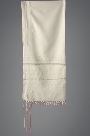 טלית בעלת פסי זהב דקים, שנארגה ביד מצמר שנטווה ידנית כדי ליצור תחושה של חספוס.